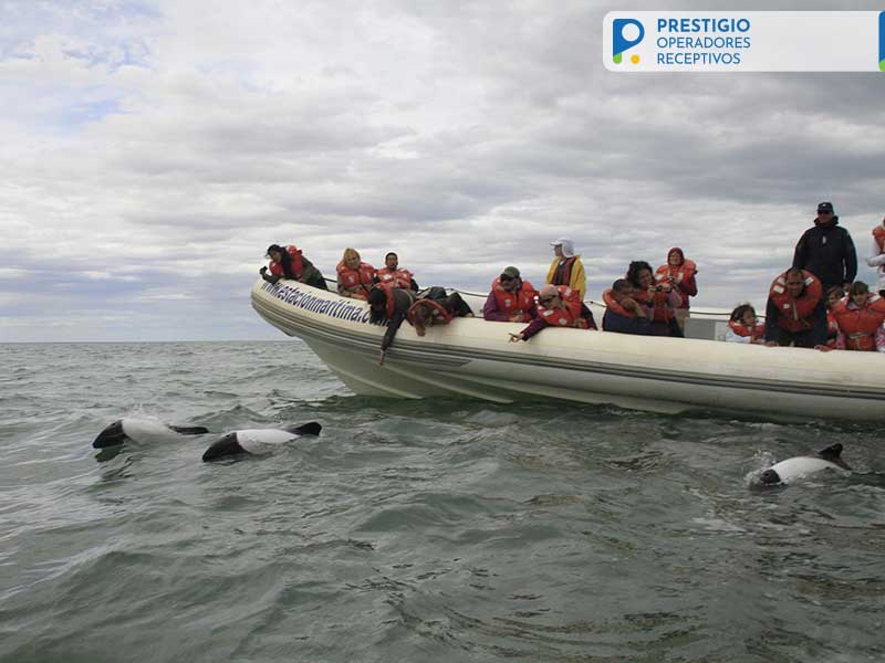 Luego la embarcación se aleja de la costa, se paran los motores y por un momento reina un silencio cortado sólo por los sonidos mezclados de las gaviotas, los gaviotines y los cormoranes. Es un momento de espera… Alguien observa a lo lejos una gran concentración de aves. La lancha se acerca y de pronto, cuando todo el grupo está atento, algo plateado y blanco emerge al lado del barco, y se escucha el fuerte ruido de un cuerpo moviendose la superficie del mar…
